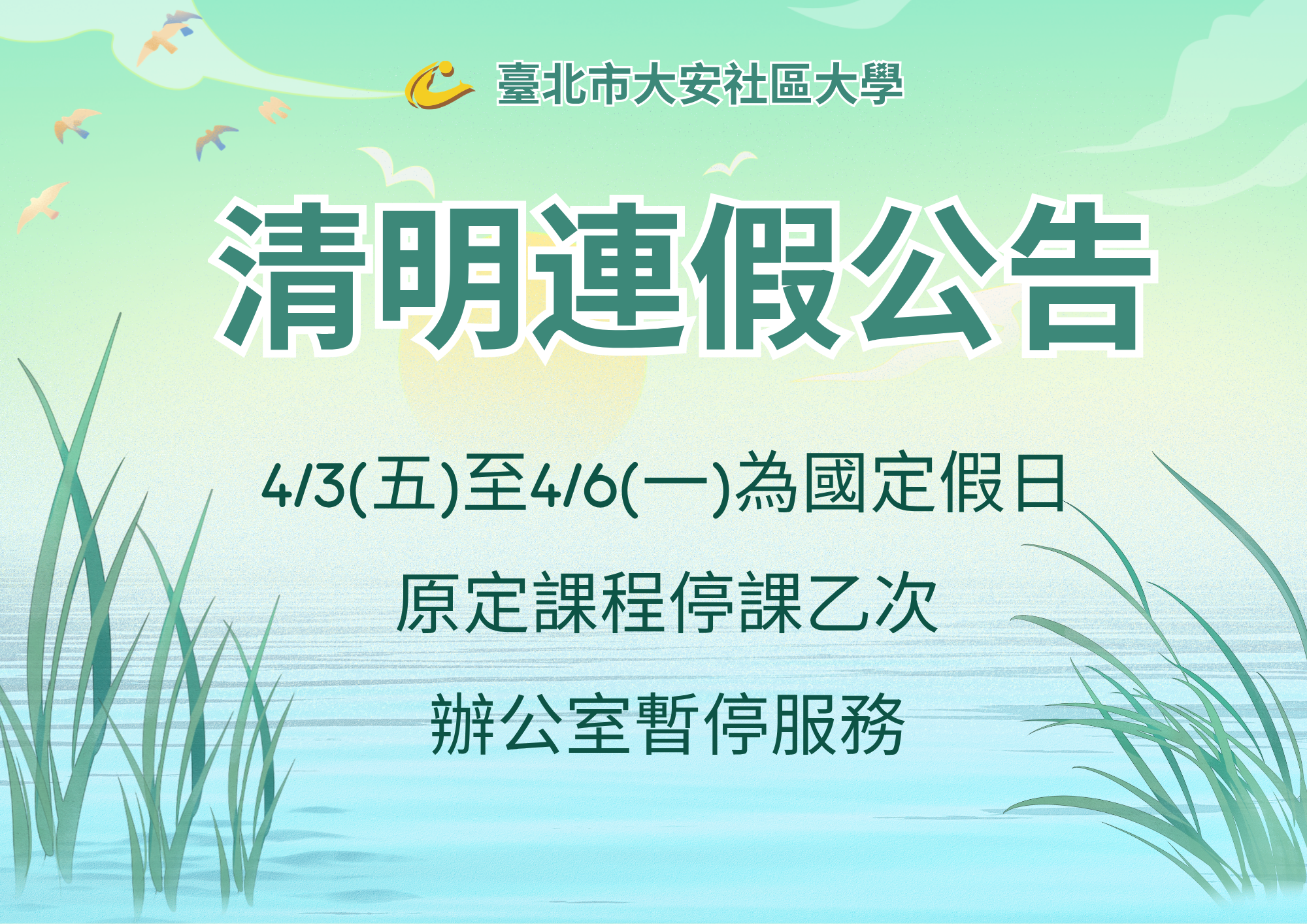 4/3(五)-4/6(一)適逢清明連假,為配合國定假日安排,本校將於連假期間暫停原定與行政服務,造成不便,敬請見諒。