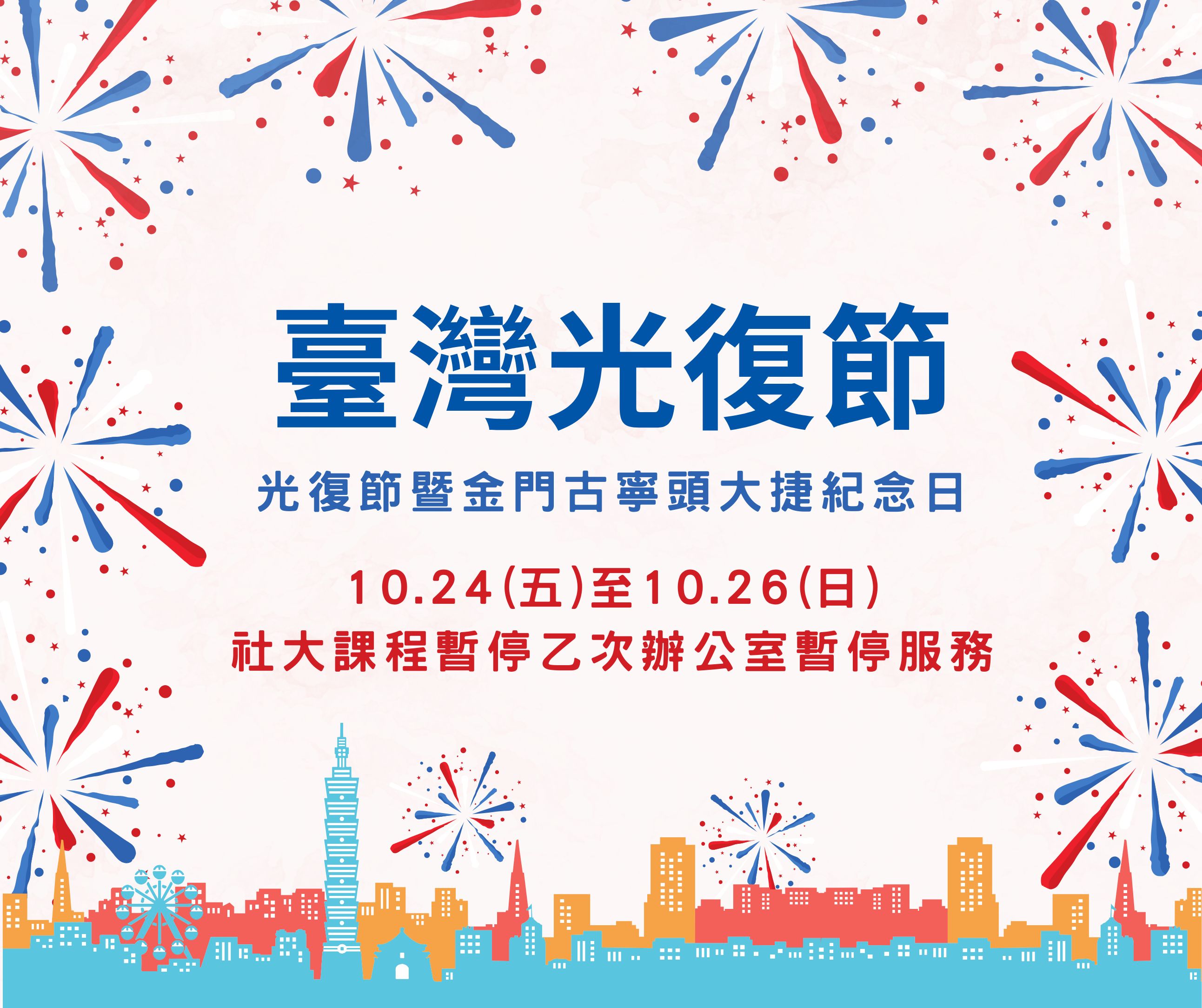 提醒您10/24(五)至10/26(日)大安社大課程停止乙次,辦公室暫停服務