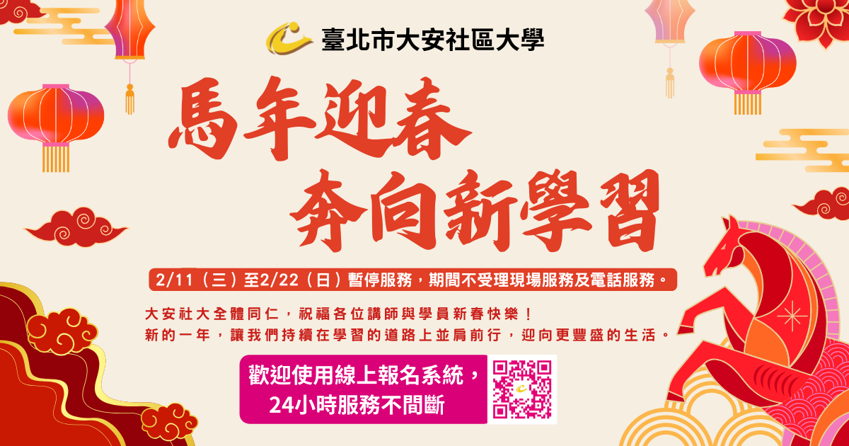 馬年迎春.奔向新學習——大安社大祝賀新春快樂,2月11日至22日春節期間暫停服務