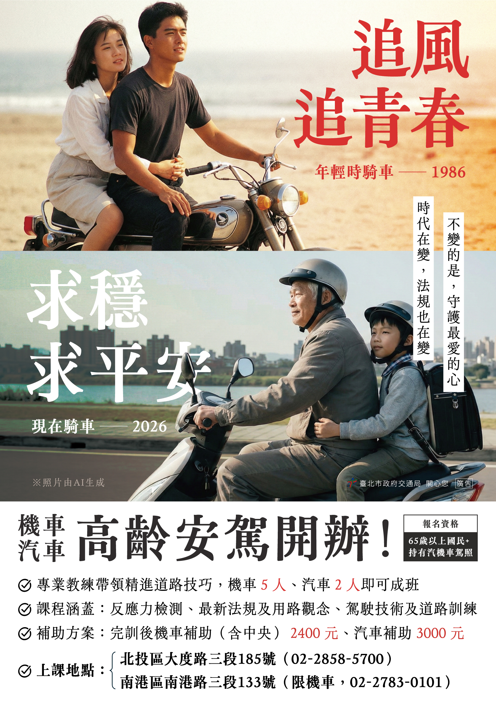 • 報名資格:65歲以上,持有汽機車駕照,報名該車種課程。