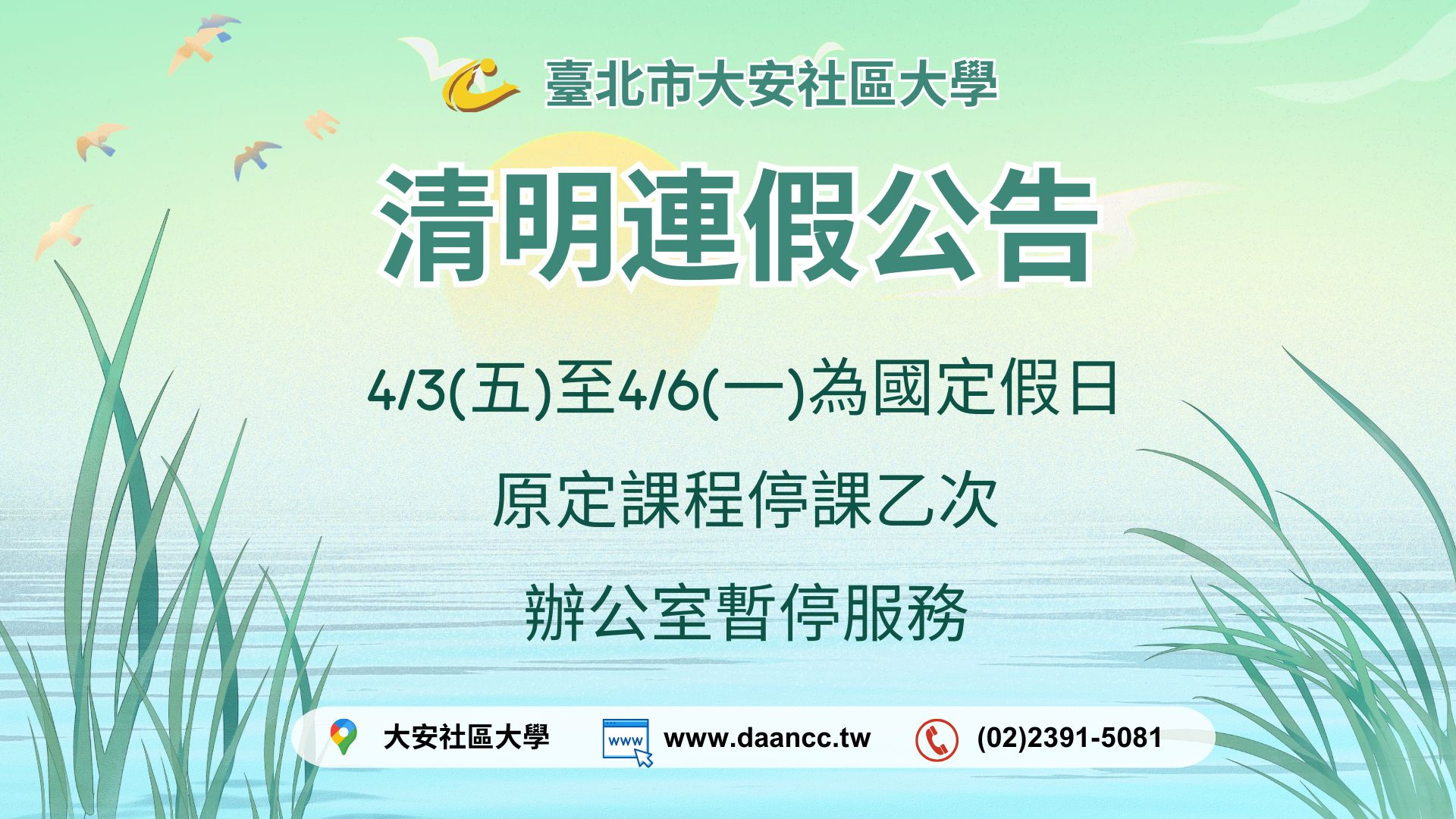4/3(五)-4/6(一)適逢清明連假,為配合國定假日安排,本校將於連假期間暫停原定與行政服務,造成不便,敬請見諒。
