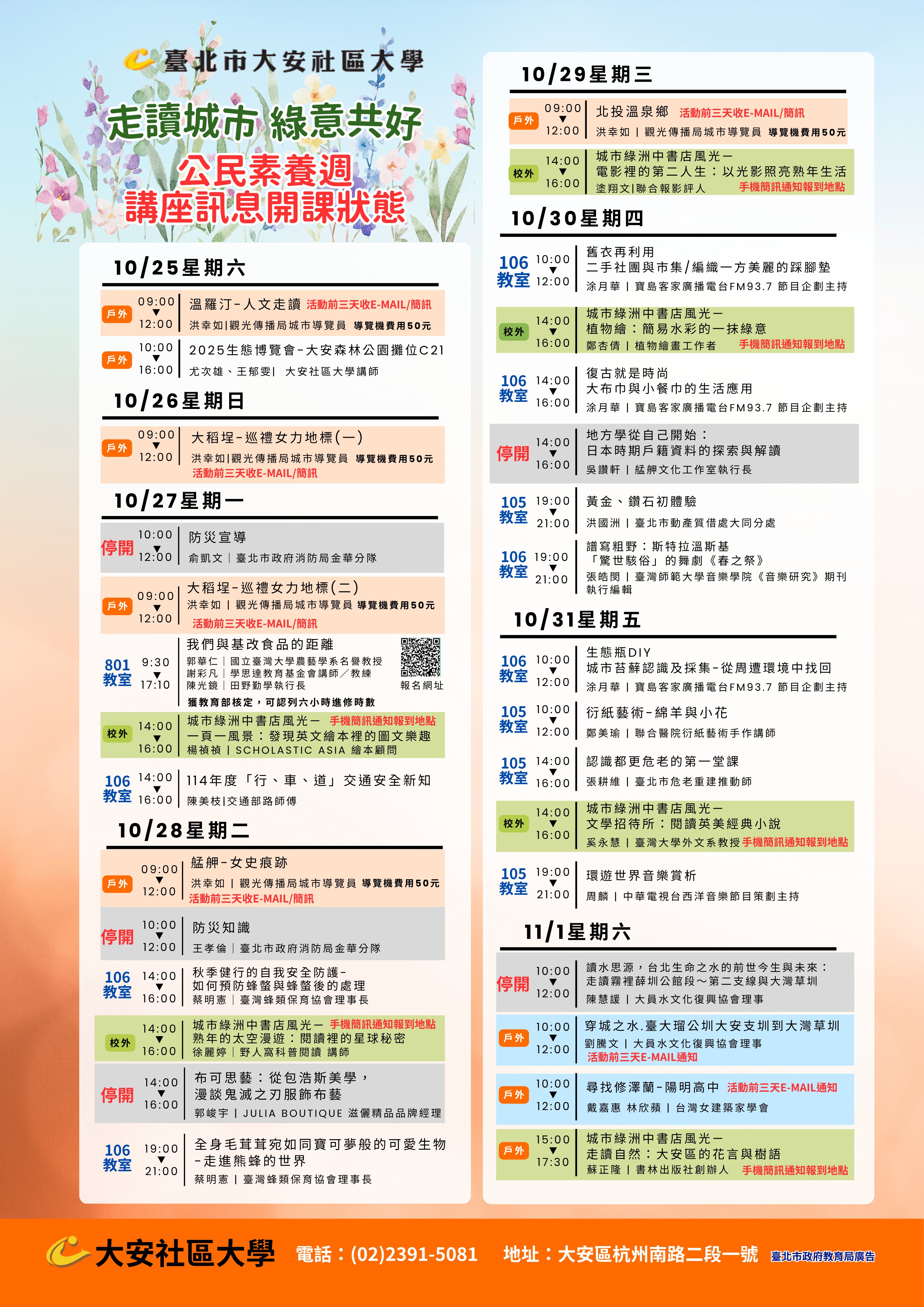 感謝學員的熱情參與,以下為各場次開課狀況,請自行查詢開課狀態,活動資訊將於三日前傳送,校外場次將於使用簡訊通知,戶外場次將使用E-MAIL通知,請留意簡訊/E-Mail,如有疑問可電洽:02-2391-5081。