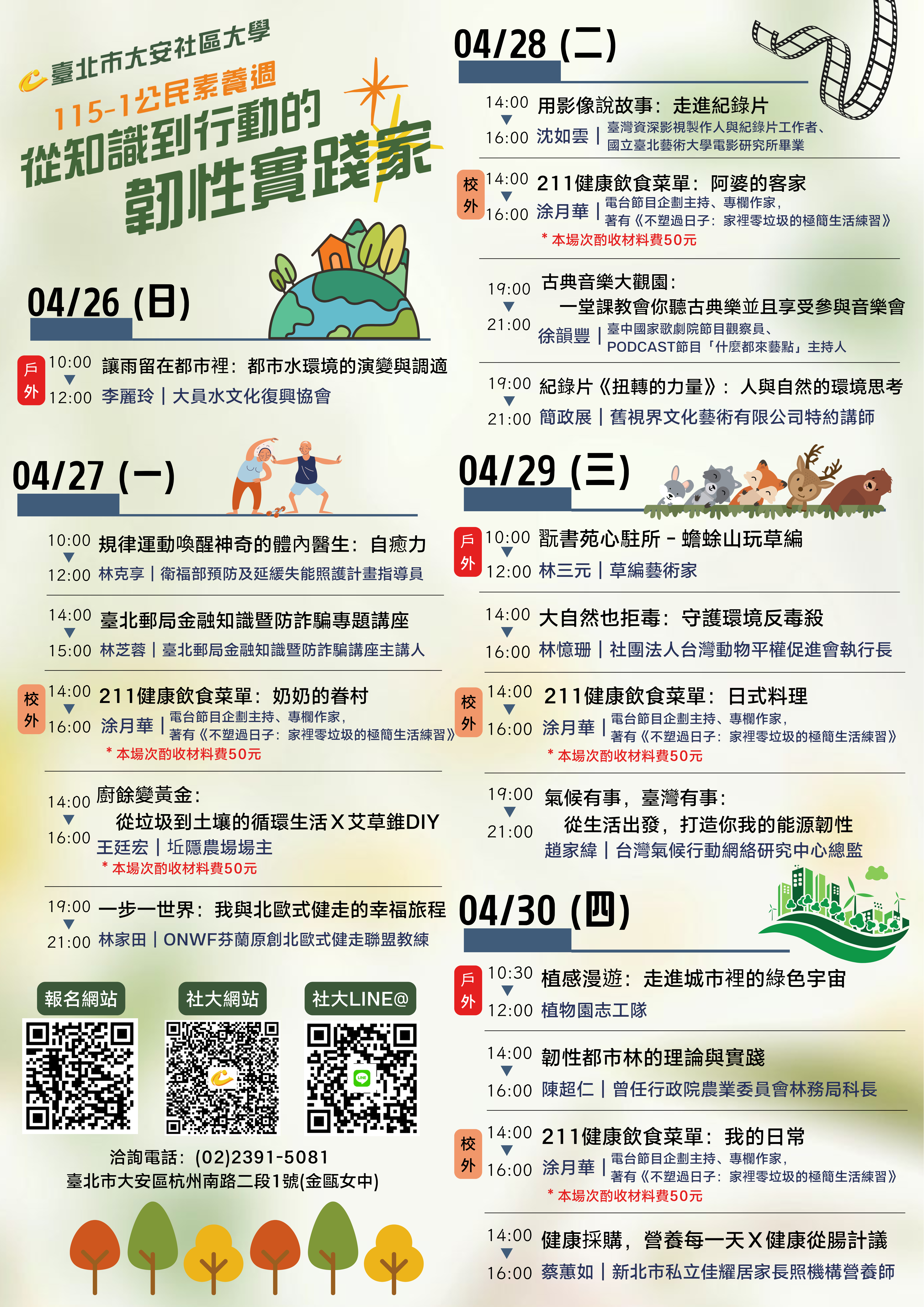 ✳︎ 「211健康飲食菜單」系列講座及「廚餘變黃金:從垃圾到土壤的循環生活」講座,須至社大辦公室繳交費用才算報名完成。