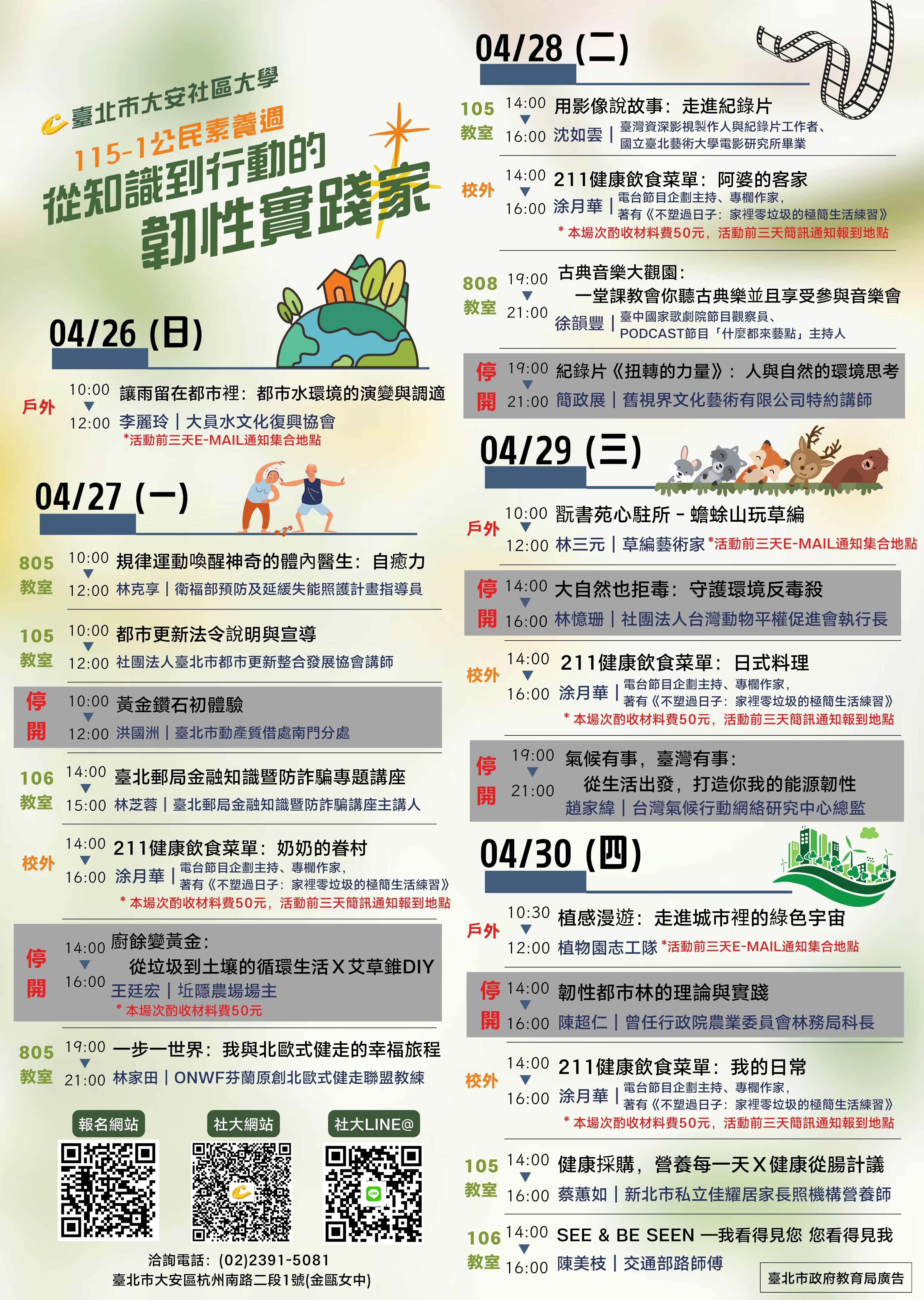 感謝學員的熱情參與,以下為各場次開課狀況,請自行查詢開課狀態,如需退費,請攜帶收據至社大辦公室辦理。